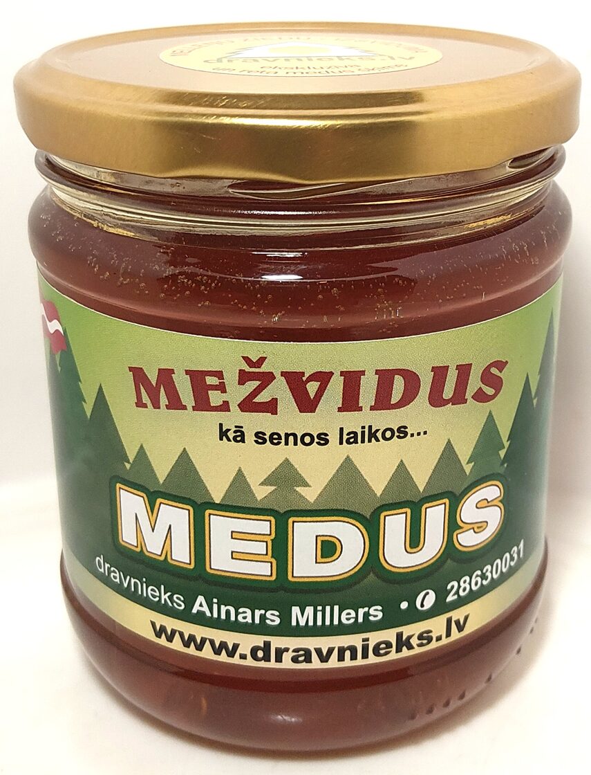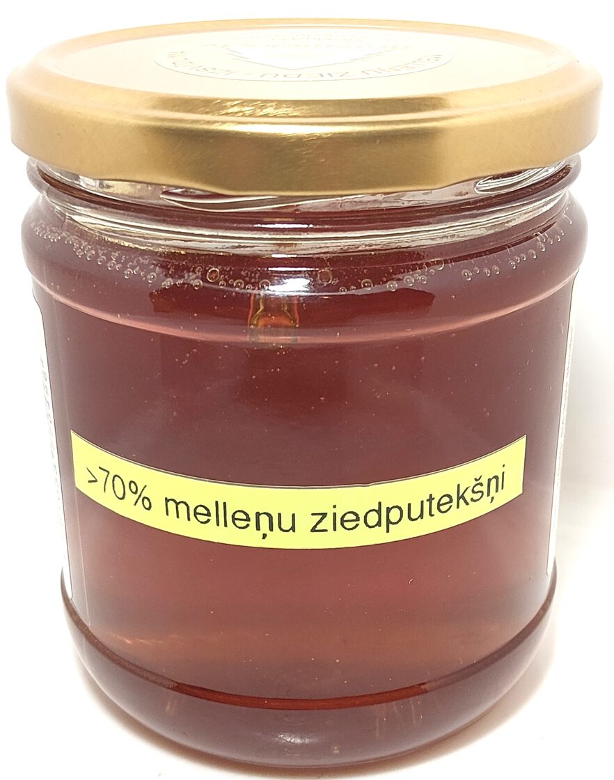 Vajadzētu uztaisīt atsevišķu etiķeti, bet nebija laika. Piedāvājumā ar Mežvidus medus uzlīmi, uz vāciņa - melleņu ziedu-izsvīduma, un burciņas aizmugurē uzlīme par melleņu ziedputekšņu saturu.