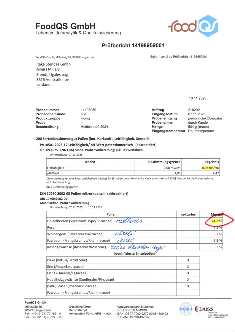 Izstādes pirmās dienas rītā nodevu paraugus analīzēm, un saņēmu solījumu, ka tās pašas dienas beigās būs rezultāts- ziņošot. Diena bija intensīva un kad izstāde vērās ciet, atcerējos, ka neesmu saņēmis ziņu. Nākamās dienas pusdienlaikā vēljoprojām ziņas nav un aizgāju painteresēties - varbūt daudz darba un aizmirsts paziņot. Stendā man atpazina- Jūs esat tas ar to melleņu medu! Slēdzienu vēl nedošot, šis medum vēl jāpārbauda, jo esot neparasti augsts melleņu ziedputekšņu saturs. Būs tikko atgriezīsies birojā.